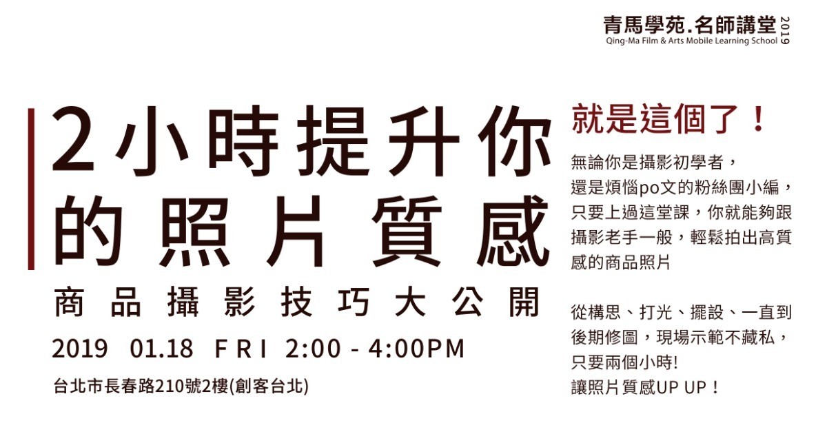 青馬影展基金會‧名師講堂 -「2小時提升你的照片品質-商品攝影技巧大公開」